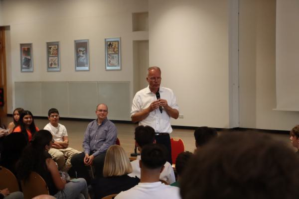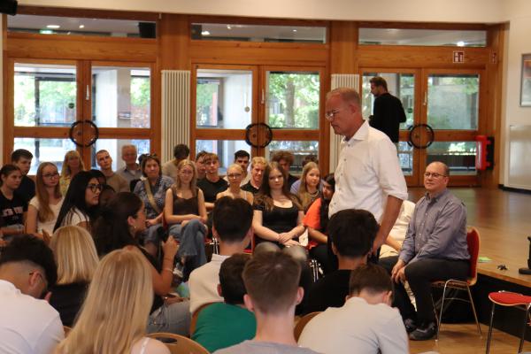 Doch seine politische Karriere begann klein – bei uns in Laatzen an der AES, an der er 1988 sein Abitur ablegte. Am 19.08.2025 ist er an die Stätte, an der er einst Schüler war, zurückgekehrt, um vor Schüler*innen von seinem Werdegang zu berichten. Doch das interessierte nicht nur die Jugendlichen, begleitet wurde er von ca. 20 Hauptstadtjournalist*innen, die sich eifrig Notizen machten.