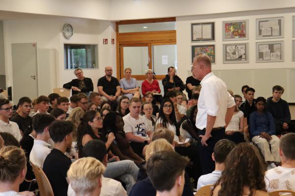 Die im Forum versammelten Schüler*innen löcherten Matthias Miersch mit zahlreichen