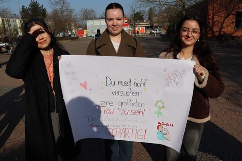 Als Zeichen der Solidarität mit FLINTA*-Personen, die tagtäglich Sexismus, Diskriminierung, unfaire Behandlung und Gewalt erleben, haben sich heute Schüler*innen und Lehrkräfte der AES in den Pausen auf dem Schulhof versammelt, Plakate hochgehalten und sind miteinander ins Gespräch gekommen.
