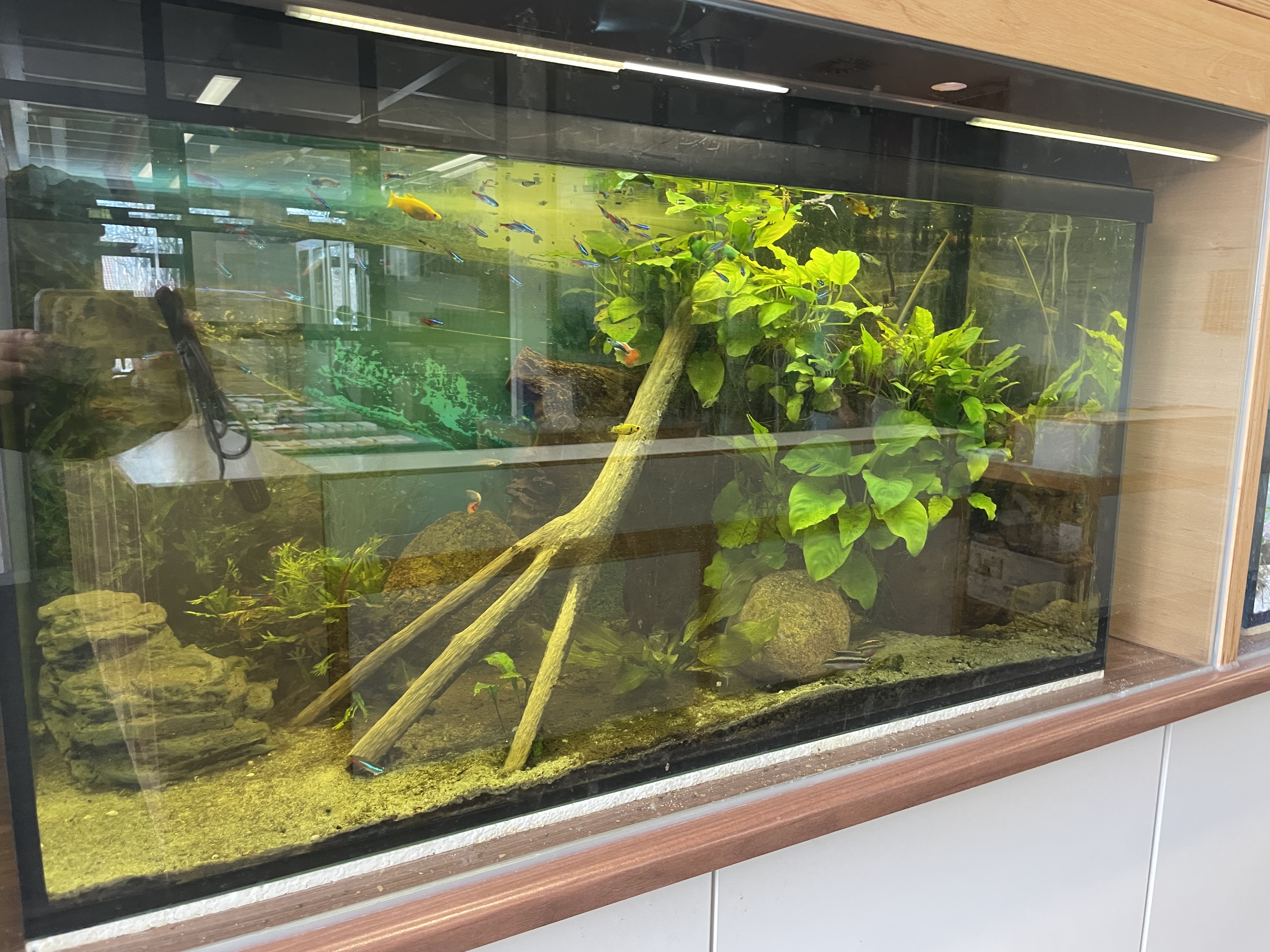 Seit letztem Donnerstag gibt es neue Fische in unseren Schulaquarien. Im rechten Becken ist der Schwarm der asiatischen Espes-Barben vergrößert worden. Im linken Becken, das dem Amazonas in Südamerika nachempfunden ist, sind weitere Neonsalmler, zwei hübsche Guppymännchen, zwei Antennenwelse, die die Scheiben sauber halten und ein Pupurprachtbuntbarsch-Pärchen eingezogen und haben sich schon prima eingelebt!Schaut doch mal vorbei! Wir bedanken uns ganz herzlich beim Stanze Gartencenter und Herrn Gummert und der Firma Sera, die uns die dringend benötigte Membranpumpe geschenkt hat!