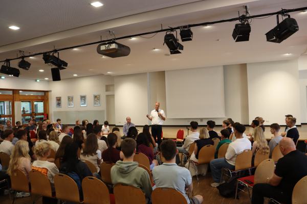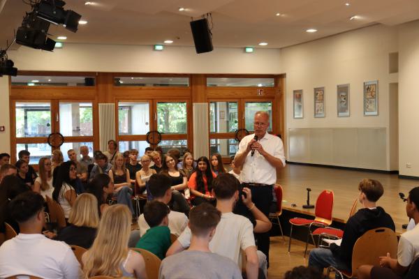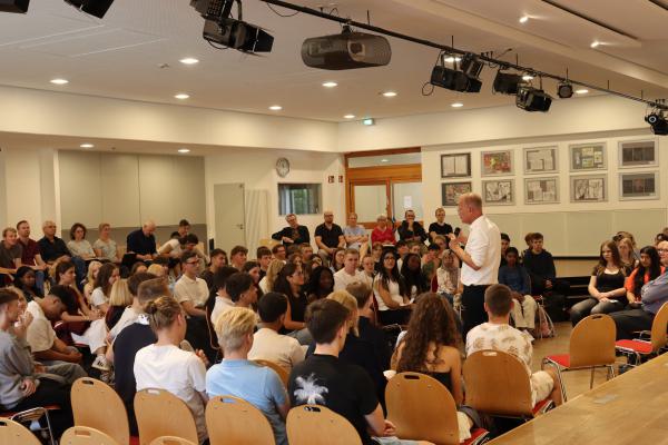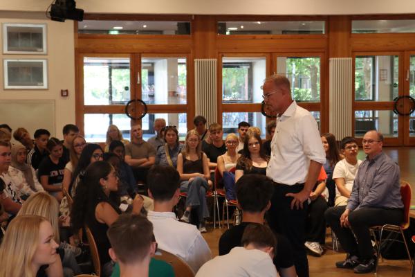 Die im Forum versammelten Schüler*innen löcherten Matthias Miersch mit zahlreichen