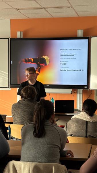 Am 05.11.25 hatten wir die besondere Gelegenheit, in das Leben von Poetry Slammer Matti Linke einzutauchen. Matti wurde von unserem Seminarfach ,,Erinnern statt Vergessen“ eingeladen, um den Schüler:innen einen exklusiven Einblick in diesen kreativen Bereich zu geben. Matti Linkes Einführung in das Thema Poetry Slam war jedoch keineswegs nur ein Vortrag, sondern eine kreative und interaktive Stunde.