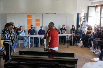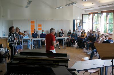 Am 2. November 2020 war das renommierte Finkelstein-Trio an der Albert-Einstein-Schule zu Gast, um mit Schülerinnen und Schülern des Musikkurses des 12 Jahrgangs die traditionelle jüdische Klezmermusik zu erarbeiten.