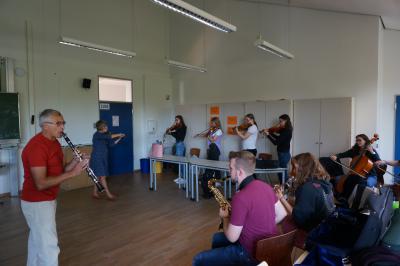 Dies war bereits der zweite Workshoptag eines Projekts im Rahmen des Bundesprogramms „Demokratie leben!“. Bereits im September hatten die Schüler*innen die Möglichkeit, ihren musikalischen Erfahrungshorizont mit Unterstützung der professionellen Klezmermusiker zu erweitern. Dabei wurden verschiedene Klezmerstücke wie z. B. der Bapolyer Freylekhs in kleineren Gruppen geprobt. Die Schüler*innen nahmen das Angebot, mit ihren vertrauten Instrumenten musikalisches Neuland zu betreten, mit großem Interesse und Faszination auf. Die Arbeit an den verschiedenen Stücken wurde daher in den Musikstunden vertieft und fortgesetzt. Trotz der Corona-bedingten Einschränkungen (die Klarinette und andere Blasinstrumente durften zwar im September, nicht aber im November gespielt werden) war die Begeisterung aller Beteiligten (Finkelstein-Trio, die Schüler*innen des Musik-Leistungskurses und ihrem Musiklehrer, Daniel Haupt) groß!